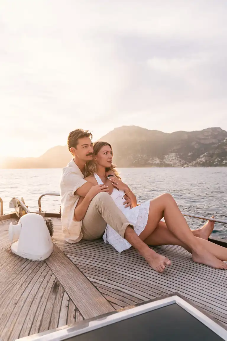 The sea naturally creates a sense of calm. When you are out on the water, you are not surrounded by crowds or noise. You are not distracted by traffic, conversations, or the usual chaos of the coastline in high season. Instead, you get clean air, open space, and a frame that focuses completely on the two of you.