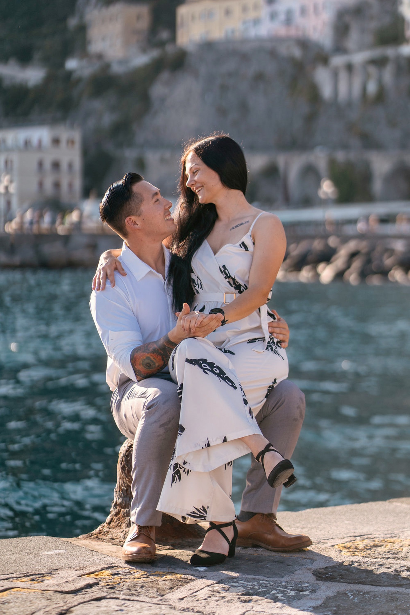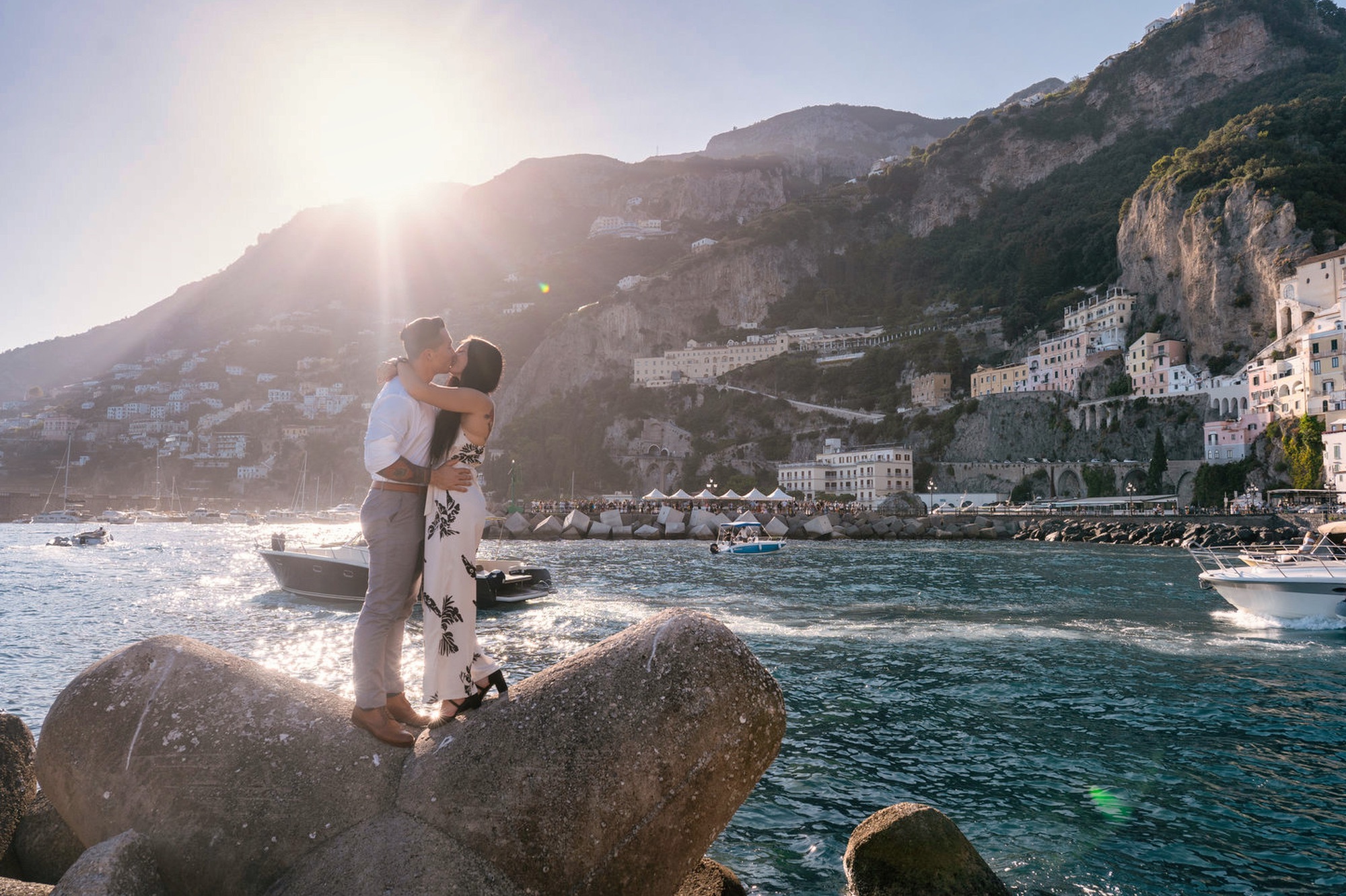 This recent proposal happened on the decks in Amalfi. It is a public setting, yet the photos look completely private. Almost no one appears in the background. The sea opens in front of you. The cliffs frame the town. It feels intimate without being isolated.